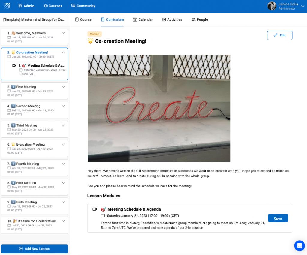 Before onboarding your members, make sure you have established the agenda for the first meeting on the platform. Log in to your account and duplicate the Mastermind template. Customize it according to your preferences. If you want to add more details, click on "edit" and start adding the elements of your choice.