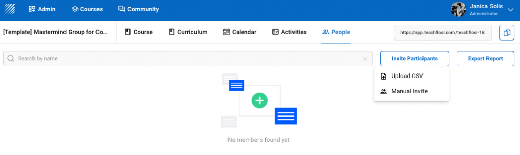 On your dashboard, select "People." Then click on "Invite Participants." You can manually invite them by entering their name and email address, or you can upload a CSV file. The members of your mastermind will automatically receive an email invitation. Another way to do it is to copy the generated link and share it with your members.