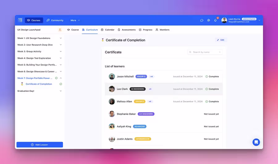 Instructors can now track certificate status for each learner, view issuance dates, and access issued certificates directly from the curriculum element.