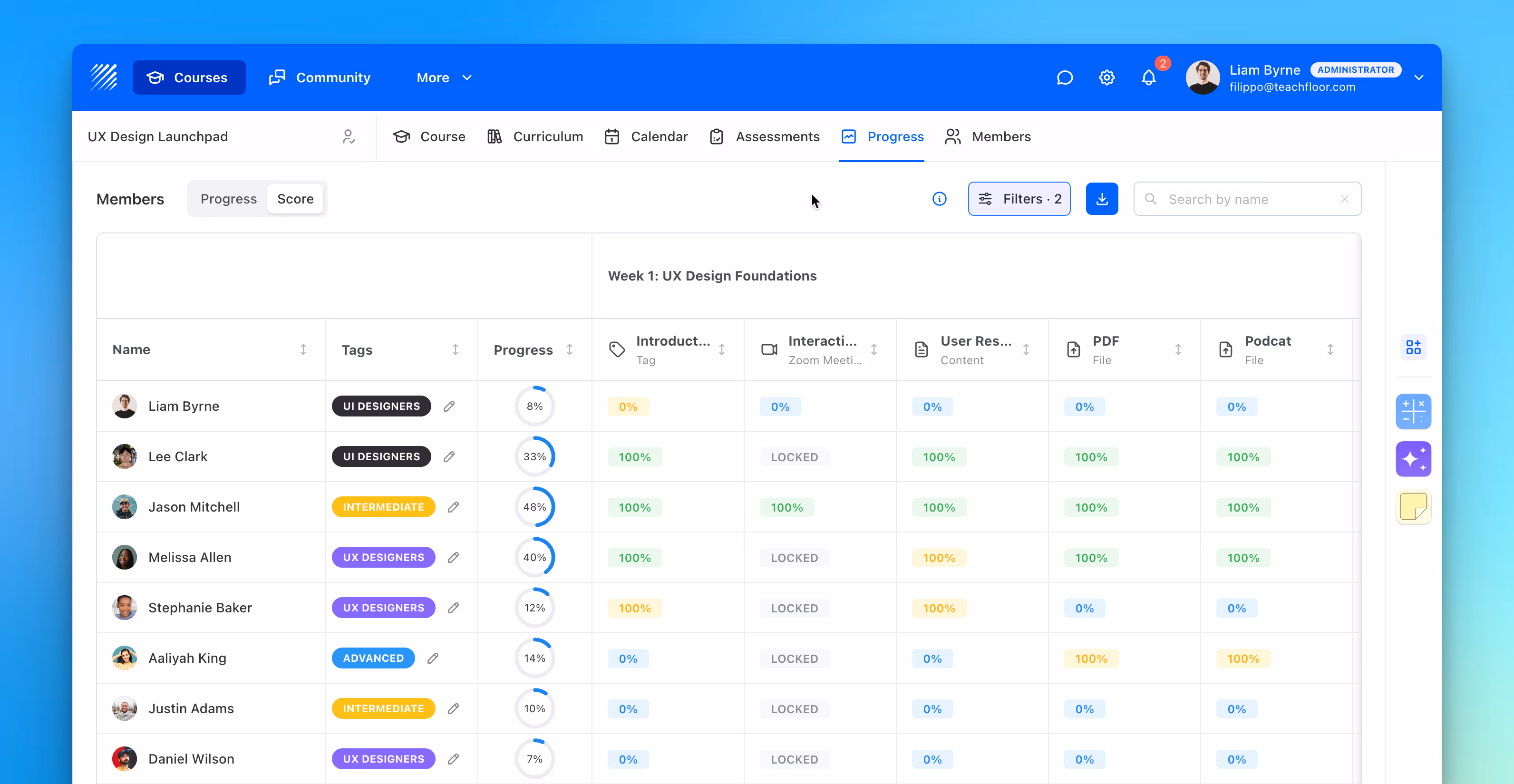 Discover Teachfloor’s new Score section track student performance lesson by lesson with completion or quality scores for better insights.