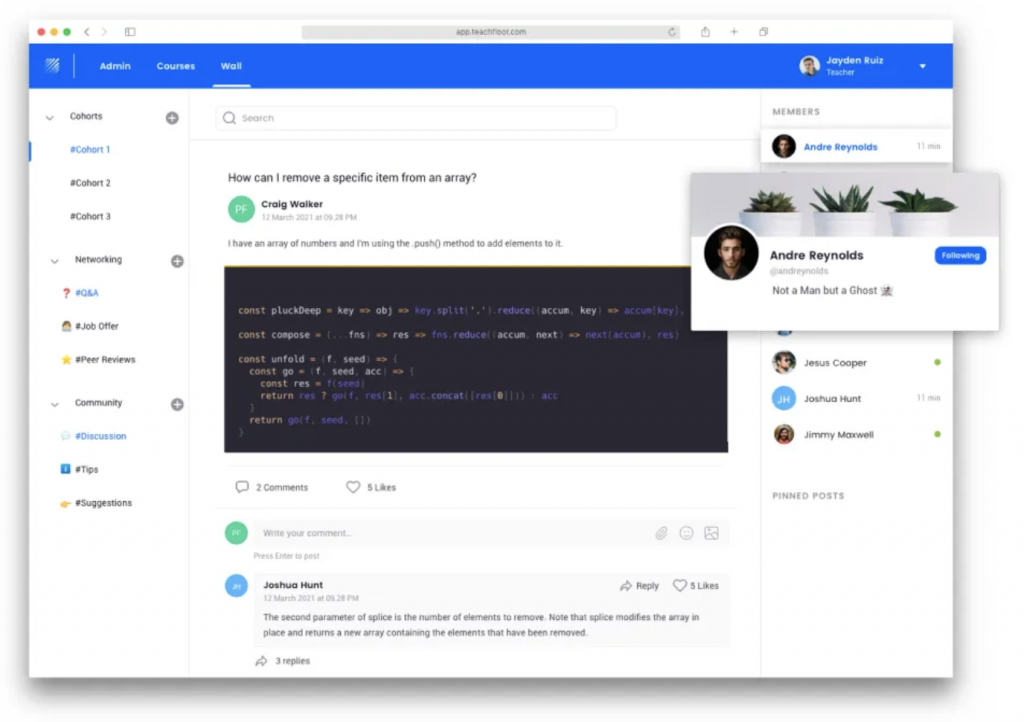 Let’s go to the highlights—the community space! Community-based learning won't work without a community space. Teachfloor is an all-in-one platform that includes a built-in community feature alongside the curriculum builder.