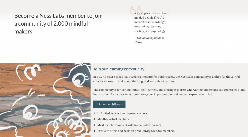 Another example of a community with annual plans is Nesslabs, a learning community for knowledge workers who want to learn with others about mindful productivity. Nesslabs only has one option: an annual membership for $49. Once you join, you will have access to its seasonal Masterclass or cohort-based courses, monthly virtual meetups, and exclusive deals & resources you will only find inside the community.