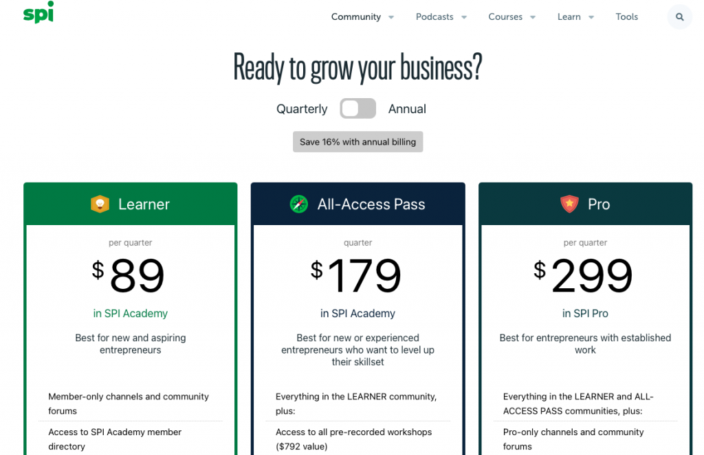 SPI Academy modeled its membership plan into three tiers according to its customer segmentation: a basic plan for new and aspiring entrepreneurs, an All Access Pass for experienced entrepreneurs, and a Pro plan for established entrepreneurs. They charge per quarter and annual billing. If you have a community with different learning levels, then try mimicking the SPI Academy’s strategy.