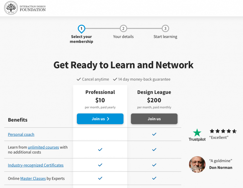 Interaction Design Foundation packaged its learning community into two plans: the Professional plan, where you only need to pay $10, and you can learn with 150,000 community members plus unlimited access to its meetups, workshops, certifications, and online masterclasses.