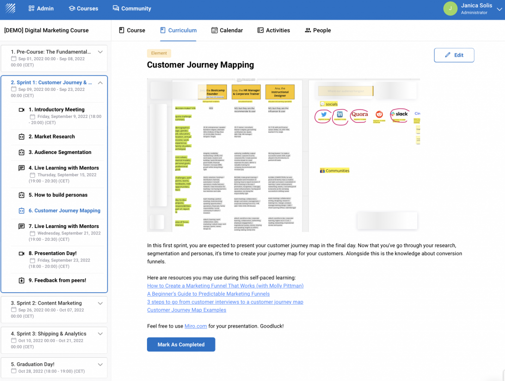 - Course structure, milestones, and prepared activities