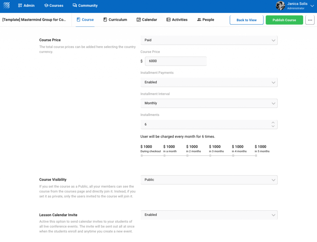 In our Mastermind Template, we charge members a $6,000 fee for 6 months. Each member can pay in installments of $1,000 per month. No need to collect it yourself because the system will automatically collect $1,000 every month for members who are listed in your course.