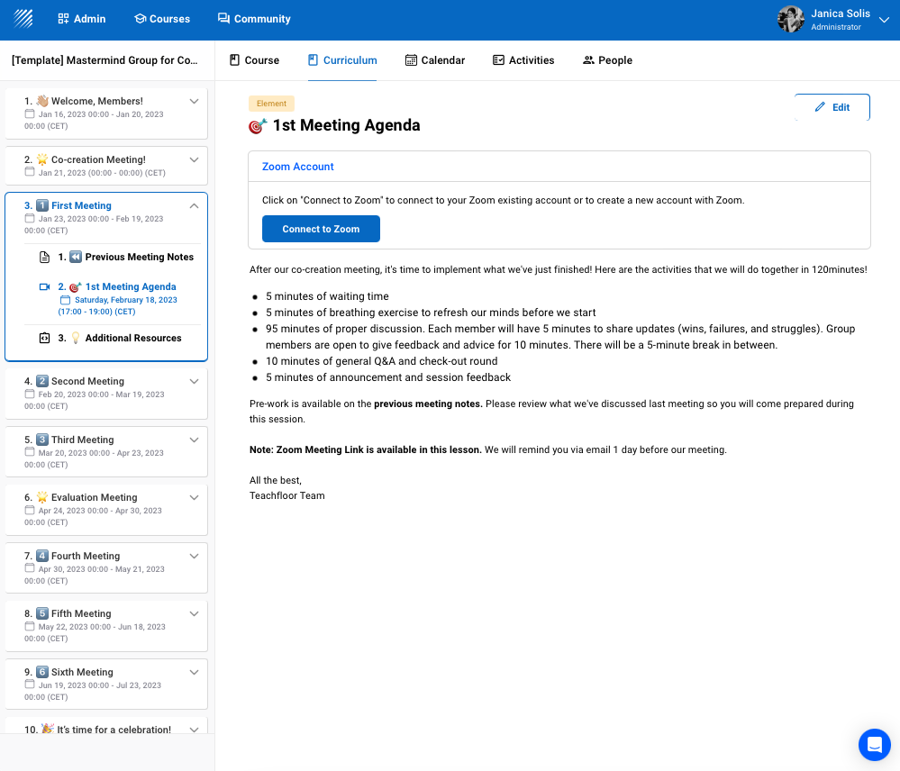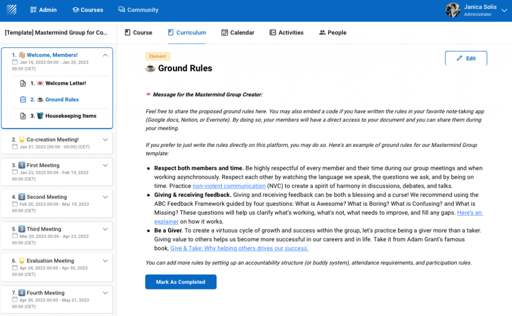 Before onboarding your members, make sure you have established the agenda for the first meeting on the platform. Log in to your account and duplicate the Mastermind template. Customize it according to your preferences. If you want to add more details, click on "edit" and start adding the elements of your choice.